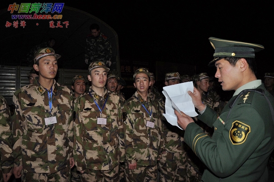12月13日,曹县武装部职工刘文杰(左一),为即将赴新疆服役的三儿子刘辉戴上光荣花。据了解,2004年,刘文杰将高中毕业的大儿子刘鹏送到部队,2007年将二儿子刘华送到济南武警部队,今年又将三儿子刘辉送到新疆服役。刘文杰将三个儿子全部送到部队保家卫国的事迹,在当地传为佳话。