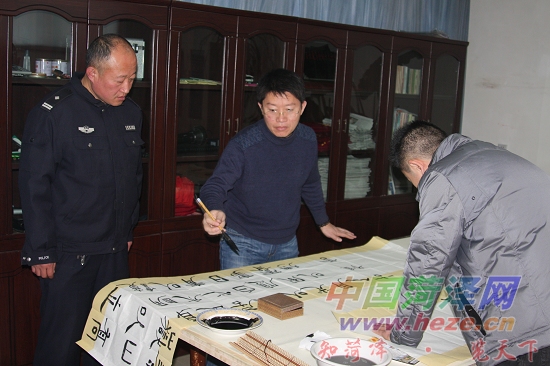 12月12日,山东省菏泽市书法协会主席曹钰、副主席杨秋平、谢瑞、成文政、武建军一行5人来到菏泽市公安局牡丹分局南城派出所张弓警务室,与“全国先进工作者”、“全国公安机关爱民模范”、“全国优秀人民警察”张弓一起共度周末,曹钰等人现场挥毫成书,用书法表达了对人民警察的敬仰之情。图为书法家曹钰正在进行书法演示。