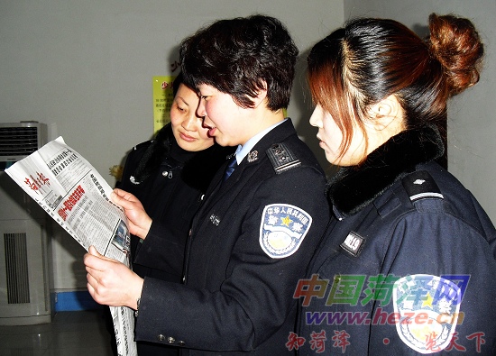 全国两会召开以后,曹县公安局城关派出所瑞芳警务室民警孔瑞芳十分关注“两会”精神,每天组织民警通过看报纸,及时了解“两会”最新动态,并利用工作之余组织民警共同学习“两会”的相关内容,进一步了解“两会”精神。图为3月7日,曹县公安局城关派出所瑞芳警务室民警共同学习“两会”精神。