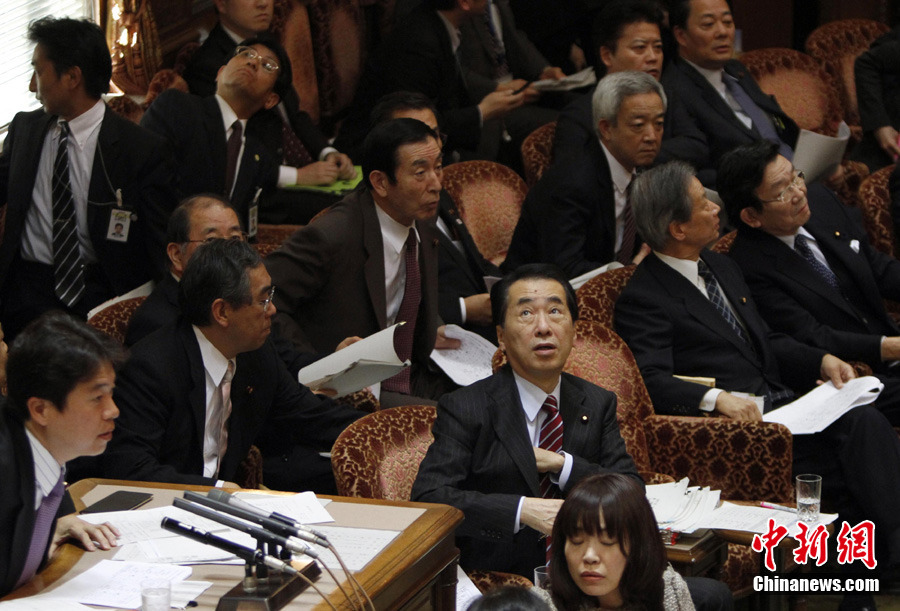 图为在东京上议院委员会会议现场,日本首相菅直人感受到震感。