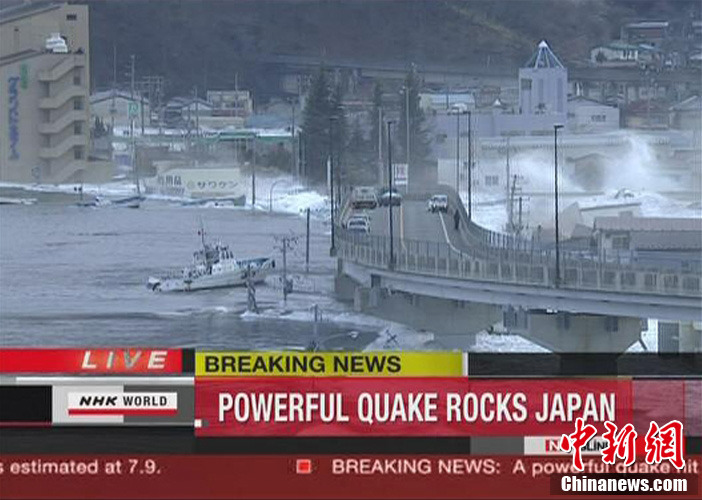 日本近海3月11日发生强烈地震,首都东京震感强烈。日本气象厅随即发布了海啸警报,称地震将引发约6米高海啸。图为日本釜山市港口附近海啸掀起水浪冲击停靠的船只。