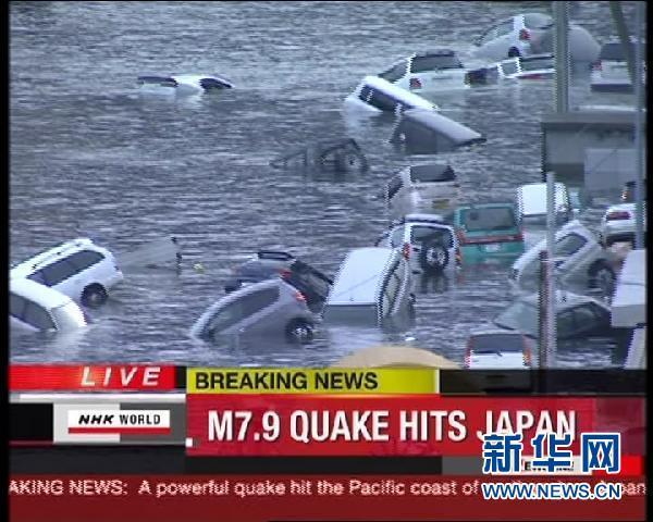 这张3月11日NHK电视台电视节目截图显示的是日本北部沿海受地震影响地区受灾情况。
