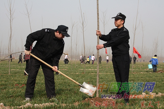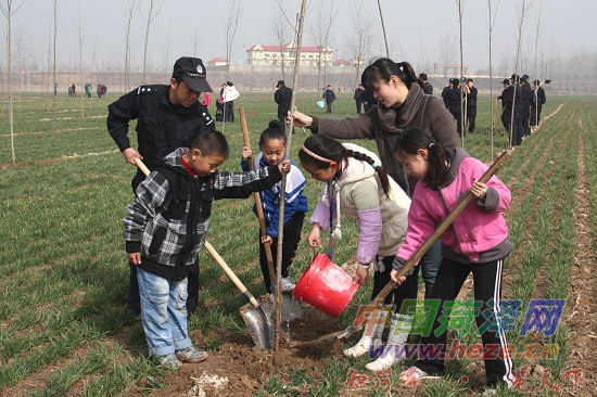 2011年3月12日,山东省菏泽市公安局牡丹分局治安大队民警正在与小朋友们一起栽树。当日,共青团菏泽市委与牡丹区黄河河务局联合在牡丹区李村镇黄河大堤滩区开展“保护母亲河,共植希望林”义务植树活动,共建菏泽市第六个“希望工程林”,菏泽市公安局牡丹分局共出动警力100余人参加了这次义务植树活动。