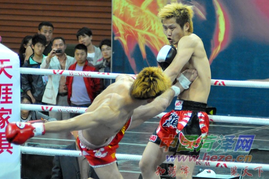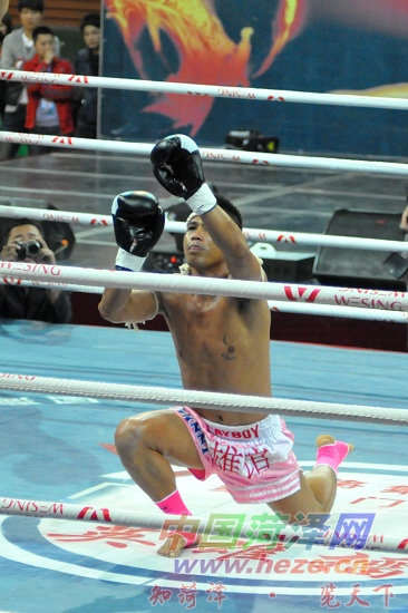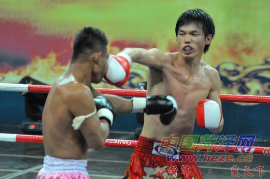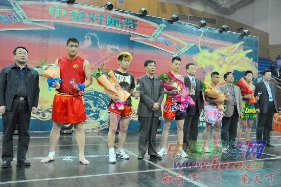 中国菏泽网消息(记者 符中安)4月17日晚,菏泽演武楼,中泰散打对抗赛隆重举行。经过激烈角逐,来自泰国的60公斤级选手Danny败于中国选手刘威,70公斤级泰国选手Delis败于中国选手徐琰,泰国65公斤级选手Kenny却以凶狠、沉稳的泰拳战胜了中方选手李沐。双方选手的精彩表现,展示了泰拳和中国武术的不同风格,获得观众阵阵喝彩。市领导杨永昌、汤建梅、黄秀玲、梁抗美、张莹,市中级人民法院院长王玮出席开幕式并观看了比赛。