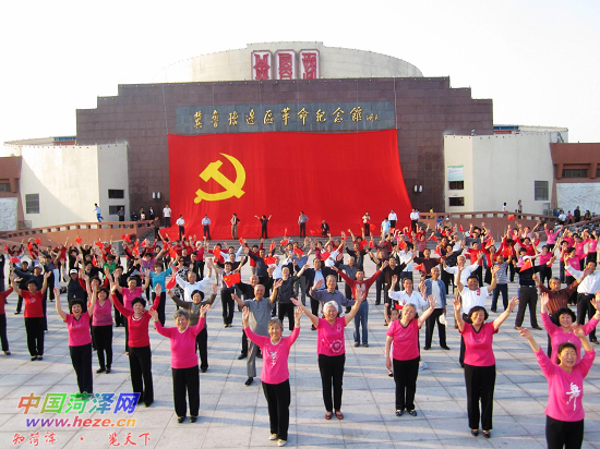 摄制组在冀鲁豫边区革命纪念馆前拍摄镜头,鲜红的巨幅党旗是老人们亲手缝制的道具