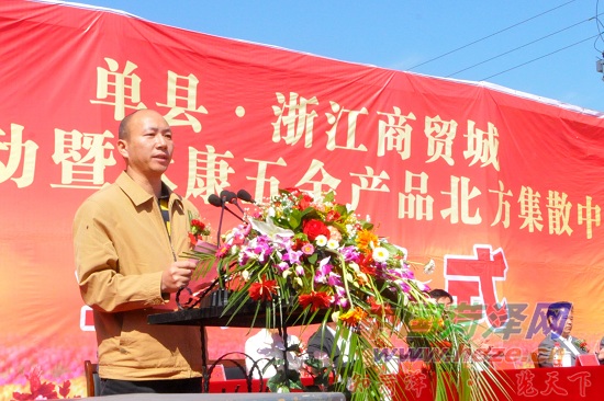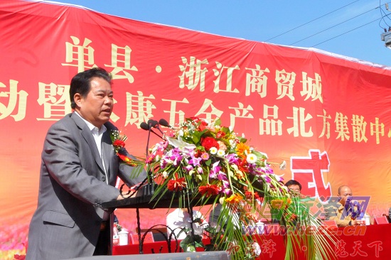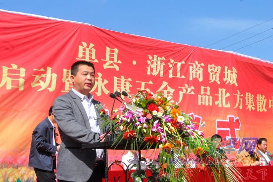 符中安)9月20日上午,单县·浙江商贸城营销中心彩旗招展鼓乐齐鸣,单县·浙江商贸城全国招商启动暨永康五金产品北方集散中心入驻签约仪式隆重举行。此活动由中共单县县委、单县人民政府主办。单县县委副书记、县长穆杰致辞,全国工商联五金机电商会常务副会长严立淼、中国商业联合会商品交易市场专业委员会主任骆毓龙出席仪式。