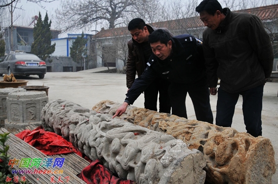11月16日,派出所民警接到群众举报,于是,迅速赶到现场,发现该龙柱用棉花柴草覆盖着,正是巨野县金山旅游区所丢失的一明代透雕滚龙柱。