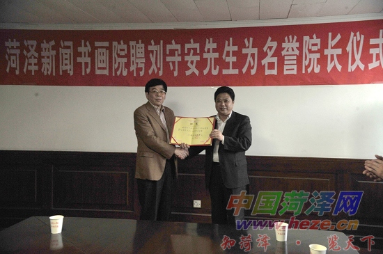 菏泽新闻书画院是由菏泽日报社创办的一家以书画艺术交流、传播为主要内容的文化实体。目前,该书画院除组织大型书画活动外,还建立开通了“书画文化新闻网”,并出版《新闻书画报》。图为菏泽日报社党委书记、社长常健向刘守安颁发聘书。记者