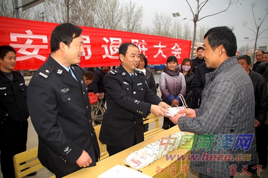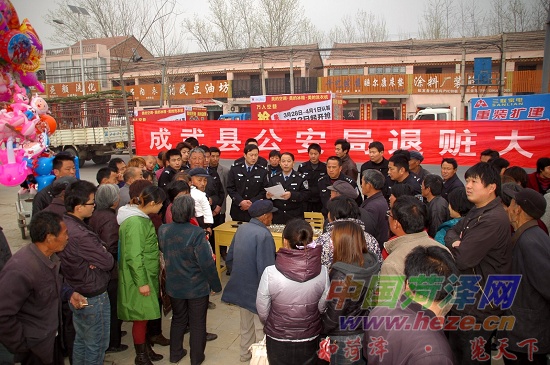3月30日上午,成武县公安局经侦大队联合南鲁派出所在南鲁集镇广场举行退赃大会,将成功侦破的李某特大合同诈骗案件的被骗赃款发还给受害农民,这是经侦大队继在汶上镇的退赃大会之后,又一次举行的退赃大会,近百名农民在这里领到了被骗款。