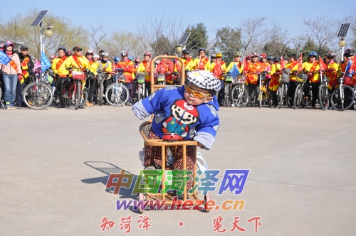 在自行车比赛场上,选手们整装待发,一孩童站在队伍前留影。 拍客张昕日前拍摄于菏泽冀鲁豫边区革命纪念馆广场。(奖话费50元,手机15269099877)
