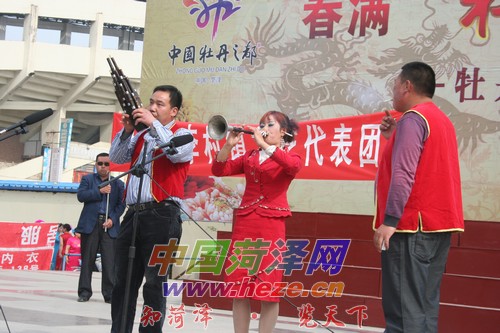 婀娜的舞姿、动听的乐曲、华美的服装、投入的演出、热情的观众……在文艺演出现场,时而锣鼓喧天,时而掌声阵阵。《丰收锣鼓》、《欢庆腰鼓》、《中国龙》等精彩节目一个接着一个。牡丹区李村镇的唢呐表演《花木兰》征服了在场所有观众。只见表演者在吹奏一曲后,将点燃的十余根香烟分别插在鼻孔、耳朵和嘴里。香烟在燃烧的同时,仍然吹得曲正腔圆,大家无不拍手叫绝。