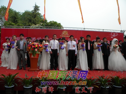 “牡丹花象征着吉祥、富贵,参加国花婚礼大典,让牡丹见证我们的爱情,很有意义。”新娘何凤君一脸幸福地说。