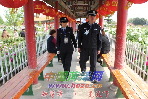 4月17日9时许,曹州百花园内,游客涌动,牡丹区治安大队的张伯海、贾亚娟等几位民警正在认真地巡逻,园内秩序良好。