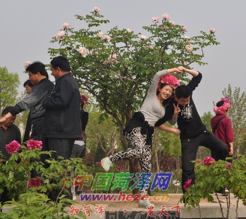 昨日,一对情侣在曹州牡丹园一株“牡丹王”前留影。这株“牡丹王”位于观花楼东北侧,是一株罕见的独干型牡丹,株型巨大,花开艳丽,形体充满阳刚之气,众多游客慕名到此欣赏。 记者 雪玲 摄