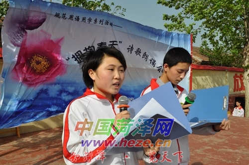 4月26日下午,牡丹区第二十二中学举行“拥抱春天”诗歌朗诵会。师生们分别朗诵了《永远跟党走》、《祖国啊,我亲爱的祖国》、《走进春天》等以讴歌爱国主义为主题的诗歌。记者 亚伟 摄