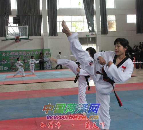 4月30日,山东省第二届大众跆拳道锦标赛在菏泽市体育局篮球馆开赛。这次比赛由山东省武术学院、山东省跆拳道运动协会主办,菏泽市体育局承办。来自全省17市的42支队伍、400多名选手参加比赛,其中我市有12支队伍参赛,年龄最小的选手只有3岁。此次比赛为期两天,包括品势比赛和竞技比赛两部分。记者 仝志华 摄
