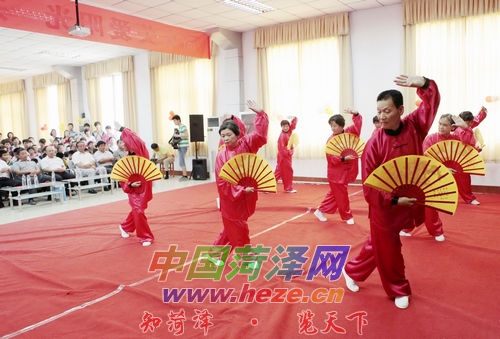 菏泽金都华庭小区老年太极拳爱好者为孩子们表演功夫扇。