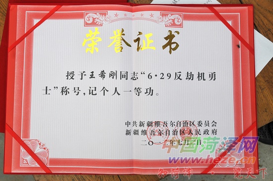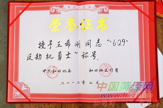 这两本证书,一本是中共新疆维吾尔自治区委员会、新疆维吾尔自治区人民政府授予王希刚“6.29反劫机勇士”称号并记个人一等功的荣誉证书,一本是中共和田地委、和田地区行署授予王希刚“6.29反劫机勇士”称号的荣誉证书。为稳妥起见,新疆有关部门先是把证书邮寄到巨野县民政局,并委托民政局转送到王希刚的手中。