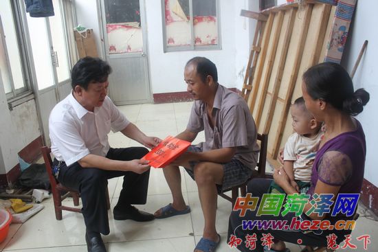 中国菏泽网消息 8月16日上午,市总工会常务副主席周继东及工会工作人员带着2000元现金、两桶油和两袋面来到家住牡丹区北城办事处句阳社区吕洪党的家。吕洪党于2003年下岗在家,2005年,其10岁的儿子身患白血病,治疗无效后去世,家中背负大笔债务。吕洪党身患疾病,生活无法自理,全家只靠妻子成东霞外出打零工挣钱。今年7月份,成东霞领养的男婴患上败血症,因无钱住院治疗,只得将孩子接回家中打针治疗。“感谢领导的关心啊,不然我们一家人真不知道该怎么过下去。”成东霞哭着说。记者 时苏建 摄