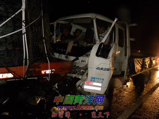 市交警支队高速一大队一中队中队长高洪军向记者介绍说,20日凌晨3时30分许,他们接到报警,称在日南高速菏泽段发生一起车祸,有人受伤需要救援。高洪军立即带领值班民警赶到现场,见一辆轻型货车和一辆大货车追尾。经初步调查,事故系雨天路滑引起。