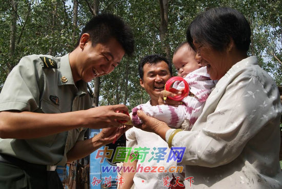 中国菏泽网消息 8月20日,郓城籍优秀士兵、一等功臣季向南来到“雷锋村”,看望失去母亲的“龙凤胎”,送上自己500元的津贴和奶粉。远在陕西宝鸡某部队服役的季向南,通过新闻媒体了解到“雷锋村”故事深受感动,这次回乡探亲之际,专门来到“雷锋村”学习感受雷锋精神。季向南还专门拜访了“中国好人”黄修良,表示一定要学习他这种长期做好事、无私奉献精神,要把“雷锋村”的故事带到部队讲给战友听,广泛宣扬“雷锋村”事迹。通讯员 魏忠友 记者 郑华伟摄