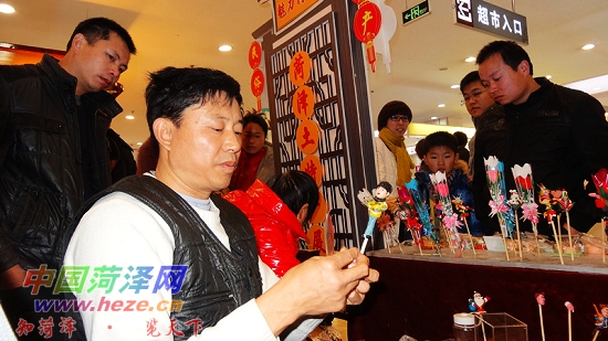 近日,在菏泽银座商城举办的民俗特色工艺展受到了市民的青睐。来自我市的葫芦雕刻、面塑以及剪纸艺人在现场制作工艺品让市民大饱眼福。据了解,此次活动自11月中旬开始,将一直持续到年底。图为面塑艺人穆绪建在制作面塑作品。