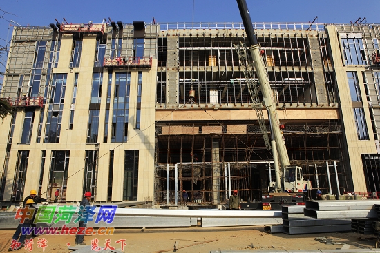 12月11日,在菏泽市图书馆前,建筑工人正在整理建筑材料。目前,市图书馆的外墙装饰、胜利广场绿化硬化等工程已接近尾声,室内装修工程正在加紧进行,工程预计在明年花会前交付使用。