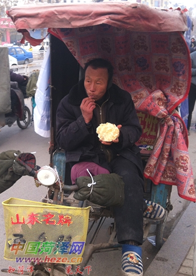 花白的头发、佝偻的身躯、残破的衣服,在城市繁华的街道上,一辆辆来回穿梭的人力三轮车让人看着格外心酸。刺骨的寒风里,60岁的车夫周福雨正蹲在牡丹北路人行道上的一根电线杆旁边等活儿。从早上到现在4个小时,他拉了两个活儿,挣了6块钱。此时,正是中午下班时间,他双眼紧盯着路上的行人,寻找着坐车人。然而,半个小时过去了,周福雨的人力三轮车却还是无人问津,他掏出兜里的烟叶袋子,又卷了一颗旱烟。无奈,点着的火柴却总是被风吹灭,尝试了几次,他放弃了,又将旱烟小心翼翼的放进了口袋。