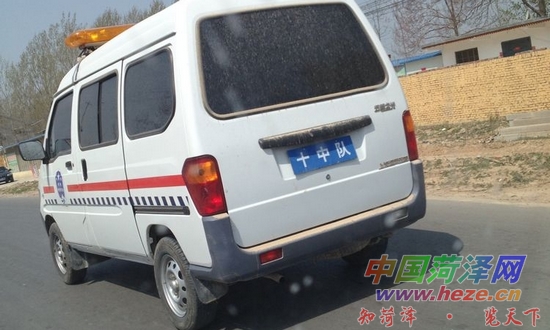 4月7日上午11时21分,腾讯微博网友“斜阳”发布了一张题为“史上最牛车牌号”的图片微博(如图)。“斜阳”告诉记者,4月7日11时许,他驾车经过曹县曹城镇田洼附近时,看到了这辆面包车,车顶安装黄色警灯,奇怪的是这辆车车牌只有“十中队”三个字,不是鲁R开头的正规车牌。于是,他拿起手机拍了下来,发到了微博上。