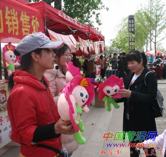 中国菏泽网消息 4月21日,在曹州牡丹园内,牡丹吉祥物“和和”、“丹丹”首次亮相牡丹节,两个小吉祥物活泼可爱的卡通形象深受游客的喜爱,立刻成了抢手货。据了解,这两个卡通人物的形象,圆圆的脑袋上“长”满牡丹花瓣,大大的眼睛活泼可爱,一个“奔跑”,展现出菏泽生机勃勃的形象;一个张开热情的双臂,迎接各地游客来洛旅游赏花。据销售人员介绍,吉祥物是吉祥的象征,也是旅游纪念品,很多游客买回去留作纪念。记者 王 燕 摄
