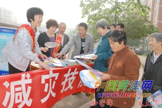 日前,市气象局开展气象防灾减灾知识进社区活动。工作人员来到牡丹区西城办事处怡海花园小区,为社区居民发放《气象知识》、《防雷减灾》、《气象灾害预警信号及防御指南》等气象防灾减灾科普宣传材料,向小区居民宣讲有关知识。 通讯员 任崇勇 摄