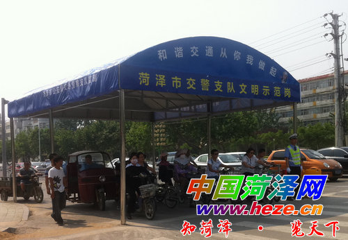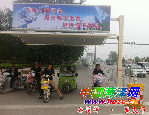 5月27日下午,记者行经市长江路、牡丹路口时,发现路口东北、西南侧出现两个遮阳棚。遮阳棚由一根厚实的铁柱支撑,棚上有一块广告牌,记者前后观看了一下,均为市政、规划、人居等公益内容。对此“新事物”,菏泽市民非常关注。菏泽网友“HZXF1975”说,骄阳下等信号灯的市民再也不那么热了,也不用为了寻找那片小小的“阴凉地儿”发愁了。众多菏泽网友回帖,赞同安装这样的遮阳棚,并希望在保证安全的前提下,在菏泽城区更多路口设置。菏泽网友“市政督察官”建议:“这种大面积的遮阳设施,最好设计成通风性能好的形状,最好布满圆状窟窿眼,以减轻大风大雪的阻力,防止大风或大雪来临时发生吹翻而伤及行人。”菏泽网友“竹韵悠悠”对遮阳伞的设置提出了期望:“这样的遮阳设施对大众来说确实是件好事,也是城市进步的表现,以前去南方城市就见到过这样的设施。只是希望这样的设施多一些公益性、安全性、普及性,少一些商业性。”