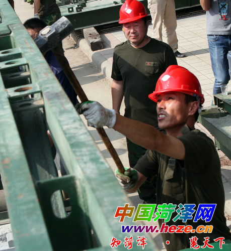 “架桥开始!”下午15时整,指挥员的一声命令,22名突击队员冲向钢铁零件。2名突击队员徒手竖起两片一米多高的桁架,其他几人抬起四米多长的横梁架在桁架中间,一位队员抡起大锤,几下将铆钉砸实,然后马上转战第二组桁架……所有程序衔接紧密。45分钟的紧张施工,抢险车辆顺利通过。