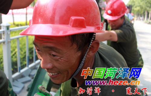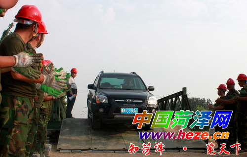 6月26日下午,一声哨响,救援车迅速通过一座刚刚架设的战备钢桥。用时45分钟,一座长33米的战备钢桥搭建完毕,横跨在城区广州路马庄桥上。