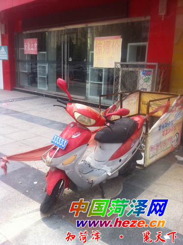 菏泽香格里拉一家餐饮店工作人员告诉记者,该店门前有一辆小型红色摩托车,也是“僵尸车”(如图),“在我们店门前停放两年多了,一直没动过。”他希望车主能将这辆“僵尸摩托”开走。