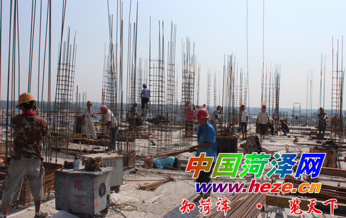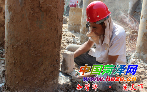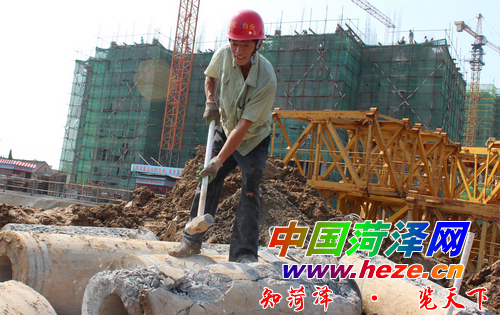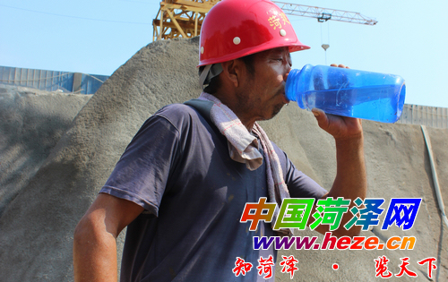 8月6日上午9时许,火辣辣的阳光刺得人眼疼,气温已经上升到30摄氏度。市人民路北段菏建集团白云建筑有限公司的一处工地上却非常繁忙,建筑工人们正忙着各自的工作。切割机碰上钢管,发出刺耳的声音;电焊机接触钢筋,发出耀眼的火花;锤子砸在水泥桩上,发出阵阵巨响……热了,甩掉上衣继续握紧锤子钉木板;累了,坐下来休息片刻后再拿起铁铲铲土;渴了,拿起大水杯,一口气灌下半杯……高温下,一线建筑工人坚守着岗位,挥汗如雨。