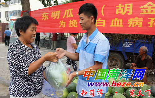 “买瓜喽,买瓜喽,买走一个西瓜,献上一份爱心……”近几天来,每逢中午,虽然气温都在37℃左右,但在“卖瓜救孙”的胡金起老人的瓜摊前,总有一个稚气未脱的小伙子满头大汗地忙活着。他叫胡栋博,本报菏泽义工团成员,家在牡丹区吕陵镇郭西堂村,是一名高中生,今年17岁。