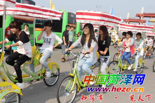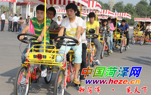 9月4日上午,牡丹区劳动技校学生在曹州牡丹园体验观光健身车。当日,曹州牡丹园举行观光健身车启动仪式。为提高市民的休闲、娱乐、健身活动,曹州牡丹园投入50辆观光健身车供市民娱乐、健身,观光健身车分为两人骑行车和四人骑行车。记者 王浩 摄