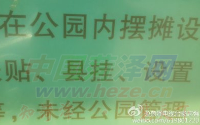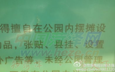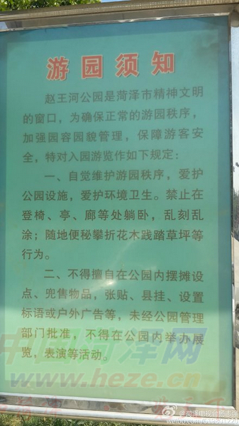 前不久,杨志强带孩子到位于菏泽双河立交桥西南侧的赵王河公园内游玩,发现公园内有一则名为《游园须知》的市政标牌,内容之中有一处明显的错别字。“‘悬挂’打印成了‘县挂’,让人看着费解,《游园须知》应该安置有几年,望及时更改。”杨志强在微博中说。