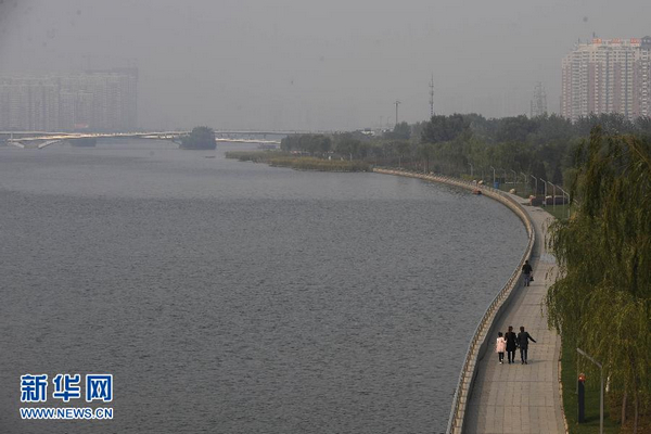 10月6日,市民在太原市滨河公园游览。当日,山西太原遭受雾霾天气侵扰。据太原市环保局数据,太原市空气质量指数达201,属于重度污染,主要污染物为PM2.5。专家建议,雾霾天气下应当减少户外活动,以免影响心肺健康。新华社记者范敏达摄