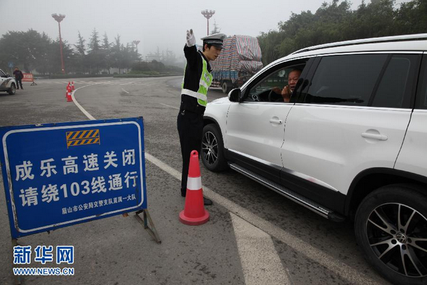 10月6日,在四川眉山市眉州大道转盘处,交警为外地司机指路。当日早晨,四川成都、达州、乐山、眉山等地出现雾天,四川境内的成雅、成乐、G93成渝环线等多条高速公路部分路段封闭,游客返程和近郊出游受到影响。新华社发(姚永亮 摄)