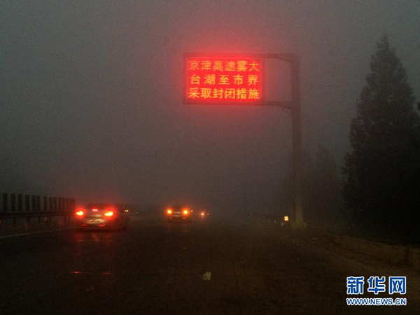 10月6日,京沪高速公路电子屏幕提示京津高速部分路段受大雾影响封闭。中央气象台10月6日6时发布霾黄色预警,预计今天白天到夜间,华北平原大部和山西东部空气污染气象条件达4级,河北中南部和京津地区的部分地区达5级,不利于空气中污染物扩散。河北大部、京津地区、山西东部和南部、河南北部等地有中度霾,局部地区有重度霾。大批自驾游返程游客受影响。新华社发(胡林庆 摄)