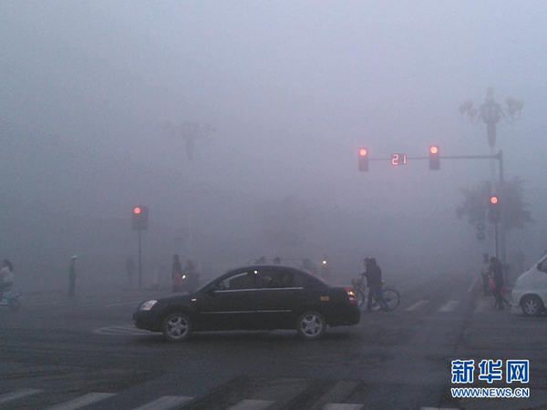 10月6日,河北省平泉县车辆在雾霾中缓慢行驶中央气象台10月6日6时发布霾黄色预警,预计今天白天到夜间,华北平原大部和山西东部空气污染气象条件达4级,河北中南部和京津地区的部分地区达5级,不利于空气中污染物扩散。河北大部、京津地区、山西东部和南部、河南北部等地有中度霾,局部地区有重度霾。大批自驾游返程游客受影响。新华社发(刘环宇 摄)