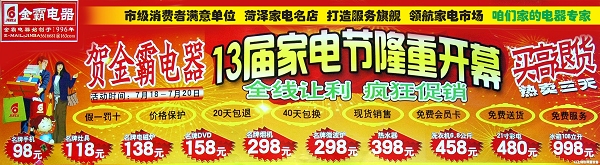 全线让利,疯狂促销,买高退货,假一罚十……从金霸电器传出的销售活动给这个夏季带来更大冲击波——金霸电器13届家电节在广大消费者的关注中于7月18-20日隆重举行。