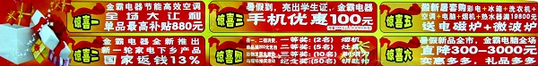 据金霸家电商场负责人介绍,本届家电节他们还有几大亮点,一是因为是暑假期间,只要亮出学生证,购买手机即时可优惠100元;全线退出新一轮家电下乡产品,百姓购买家电,国家返钱会达到13%。