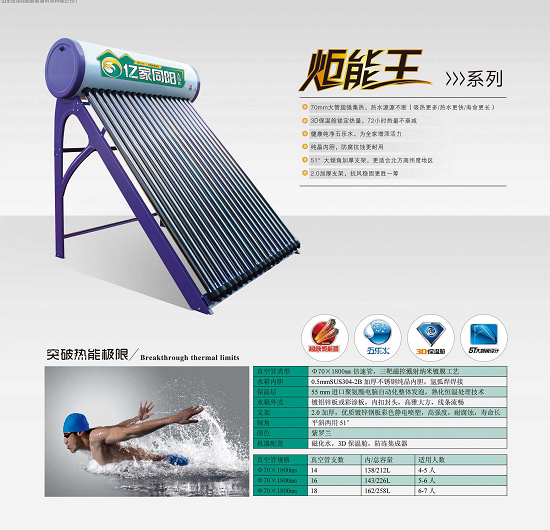 山东同阳新能源科技有限公司坐落于被誉为太阳能故乡的山东省菏泽市,是一家集科研、生产、贸易于一体的太阳能专业公司。公司拥有国际先进的检测和一流的生产设备,同时拥有一批高素质技术人员,依托山东太阳能品牌在市场上的领导作用,以及良好的市场发展形势,几年来公司取得了丰硕的成果。开发研制九大系列太阳能热水器和太阳能路灯、草坪灯等产品。