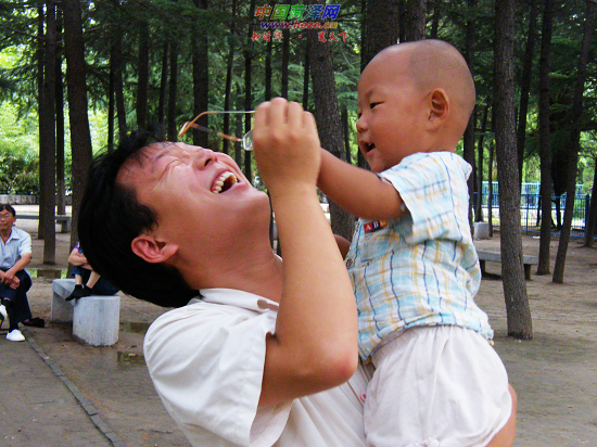 “爸爸,我来给你戴眼镜。”孩子的这一举动引得大人哈哈大笑。8月11日,记者拍摄于菏泽天香公园。刘锦 摄
