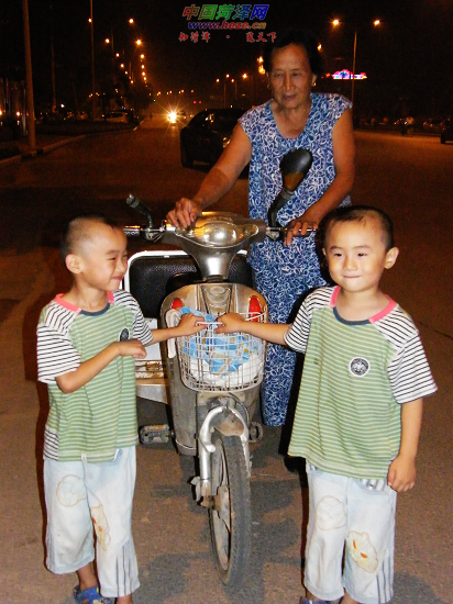 老人的电动车没有电了,兄弟俩主动帮老人拉车。8月10日,记者拍摄于市长江路。刘锦 摄