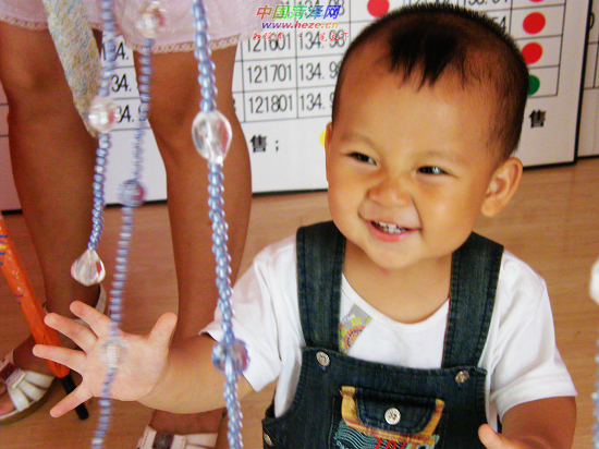 父母正忙,一个孩子自己撩起珠帘玩耍,时不时还哈哈大笑。8月9日,记者拍摄于市华英路某售楼处。 刘锦 摄