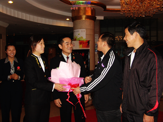 10月11日早晨,安徽省散打代表队工作人员入住花都大酒店,受到了该酒店员工热烈欢迎,鲜花和掌声让远道而来的贵宾感受到菏泽人民的热情。第十一届全国运动会武术散打比赛将于10月14日-17日在菏泽演武楼举行,全国各地参赛选手10月10日起陆续来菏报到。